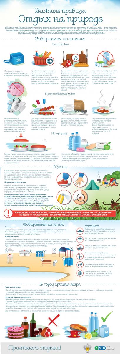 Перед началом длинных майских праздников, а также летнего сезона, когда жители городов и поселений отправятся на пикники и на прогулки по лесам, а с наступлением купального сезона – на пляжи, Управление Роспотребнадзора рекомендует придерживаться нескольких простых правил, чтобы впечатления от времяпрепровождения на природе не были омрачены последующими неприятностями со здоровьем.