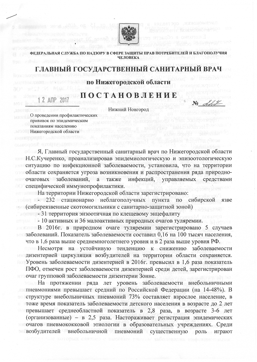Постановление от 12.04.17 №227 «О проведении профилактических прививок по эпидемическим показаниям населению Нижегородской области»