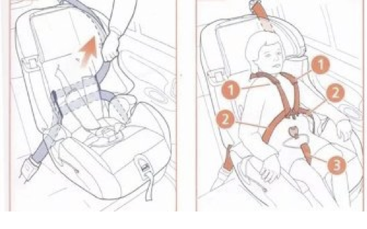 Маркировочный ярлык должен иметь информацию о полном или сокращенном названии изготовителя, либо фабричной марки; год производства. Если удерживающее устройство предназначено для использования в сочетании с ремнем безопасности для взрослых, то способ правильного пристегивания лямок (пример - рис.1) должен быть четко указан на чертеже, стационарно прикрепленном к удерживающему устройству. Направление движения лямки указывается на изделии с помощью кодировки цвета (красный – при установке обращенного вперед устройства; синий - обращенного назад устройства).