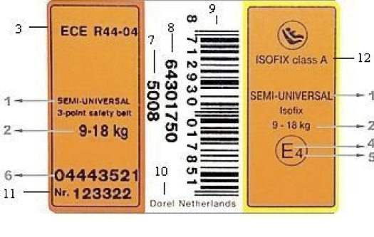 - Номер соответствия. Первые две цифры (04) показывают, какой версии стандарта соответствует автокресло, например, ECE R 44/04.