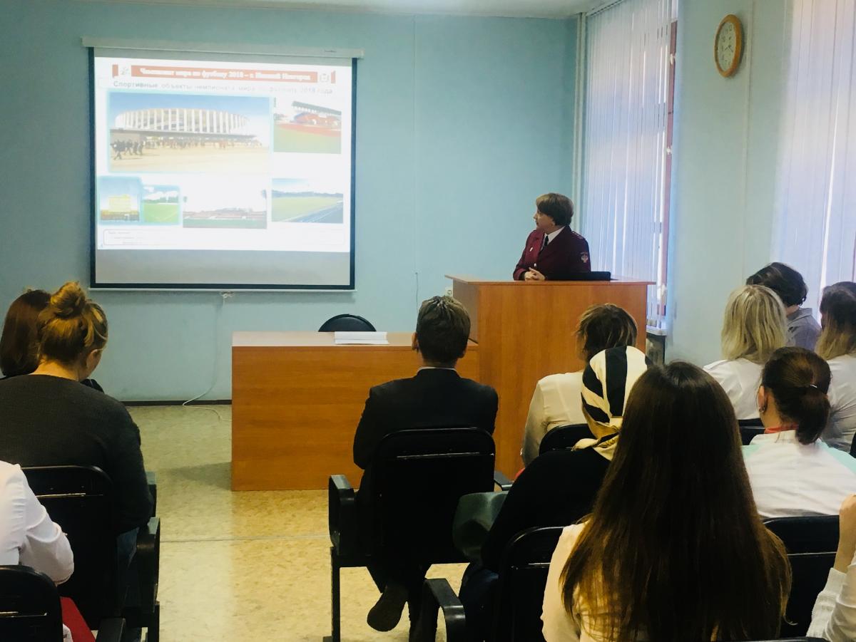 В ходе мероприятия Н.С.Кучеренко рассказала будущим гигиенистам и эпидемиологам о работе, проведенной Управлением в период подготовки и проведения Чемпионата мира по футболу FIFA2018 года в г.Н.Новгород, поблагодарила за помощь студентов, которые работали волонтёрами в период проведения Чемпионата.