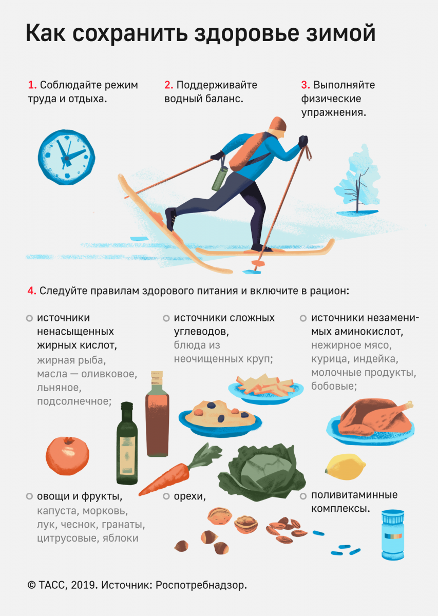 Совокупное воздействие неблагоприятных факторов внешней среды усугубляется еще и тяжелыми для организма человека условиями – низкой температурой, ее перепадами между улицей и помещением, холодным воздухом и ветром вне зданий и сухим воздухом внутри помещений, дефицитом солнечного света из-за короткого светового дня. И все это – при нехватке в питании полноценных по составу свежих фруктов, овощей, ягод, зелени на фоне общей несбалансированности рациона, приводит к ослаблению иммунной системы.