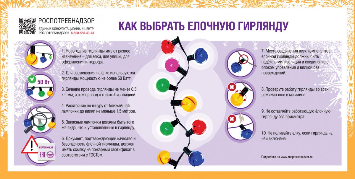Продавец по просьбе покупателя обязан представить документ, подтверждающий качество и безопасность гирлянды. Такой документ должен иметь ссылку на пожарный сертификат в соответствии с ГОСТом. Необходимо проверить срок службы изделия, а также наличие инструкции по использованию, ознакомиться с основными потребительскими свойствами, типом и характеристиками электрических ламп, номинальным напряжением гирлянды. При этом информация о товаре и изготовителе должна быть на русском языке. Сечение провода гирлянды должно быть не менее 0,5 квадратных миллиметров, а сам провод должен иметь качественную, гибкую и плотную изоляцию. Кроме того, от вилки до ближайшей лампочки гирлянды расстояние шнура должно составлять не менее 1,5 метра. Также к гирлянде должны прилагаться запасные лампочки того же вида, что и установленные в нее.