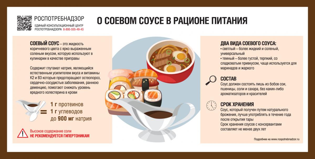 Роспотребнадзор напоминает, что при употреблении приправ и соусов, стоит обращать внимание на содержание в них соли. Соевый соус – жидкость коричневого цвета с ярко выраженным соленым вкусом, которую используют в кулинарии в качестве приправы. Соус используют при употреблении суши, добавляют в рис, салаты, маринады, используют, чтобы придать аппетитный цвет блюдам.