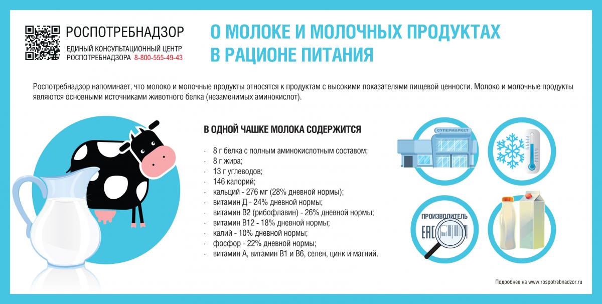 Роспотребнадзор напоминает, что молоко и молочные продукты относятся к продуктам с высокими показателями пищевой ценности. Они содержат значительное количество незаменимых нутриентов, обладают высокой переваримостью и усвояемостью. В питании молоко и молочные продукты являются основными источниками животного белка (незаменимых аминокислот).