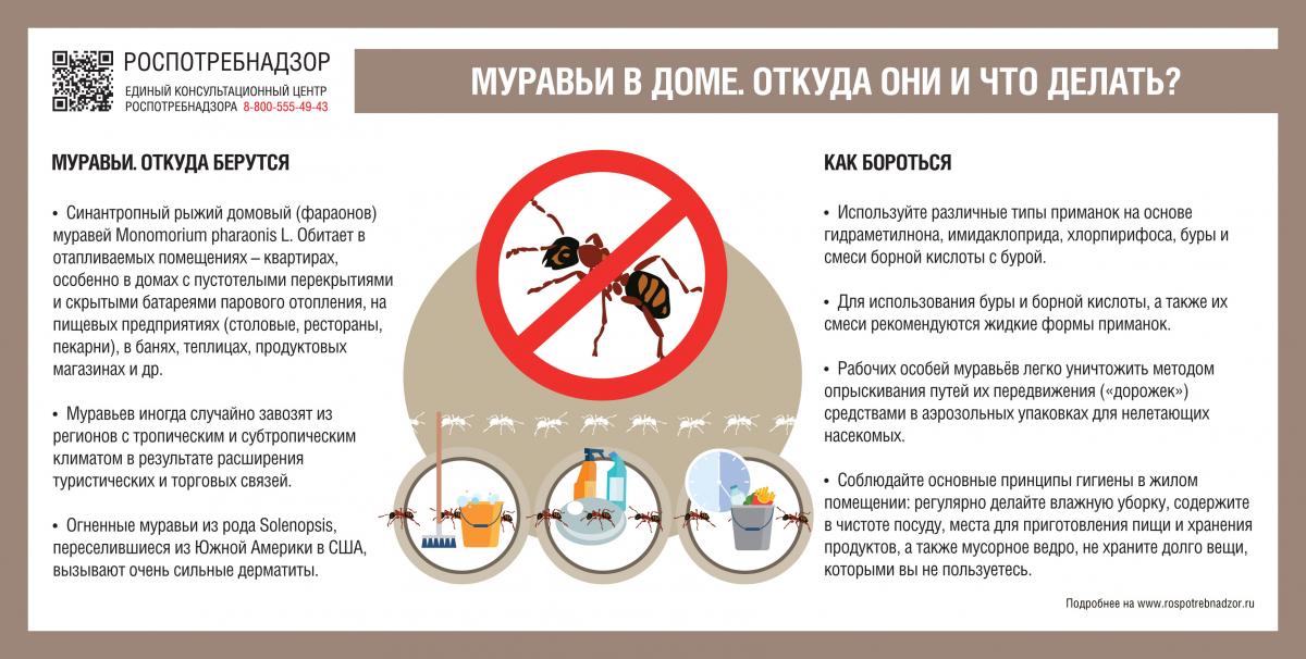 Роспотребнадзор напоминает, что самым распространенным видом муравьев, который живет в помещениях, является синантропный рыжий домовый (фараонов) муравей Monomorium pharaonis L. Обитает он исключительно в отапливаемых помещениях – квартирах, особенно в домах с пустотелыми перекрытиями и скрытыми батареями парового отопления, на пищевых предприятиях (столовые, рестораны, пекарни), в банях, теплицах, продуктовых магазинах и т.д. Срок развития от яйца до рабочей особи составляет в среднем 38-40 дней. Из муравьёв этот вид считается наиболее активным механическим переносчиком возбудителей инфекционных болезней. Стоит отметить, что муравьи, обитающие в природе, например, Lasius niger L. (чёрный садовый муравей), начали заселять одноэтажные жилища, то есть происходит процесс синантропизации этих насекомых. Еще один вид – бледноногий садовый муравей Lasius alienus Foerst тоже переходит на синантропный образ жизни.