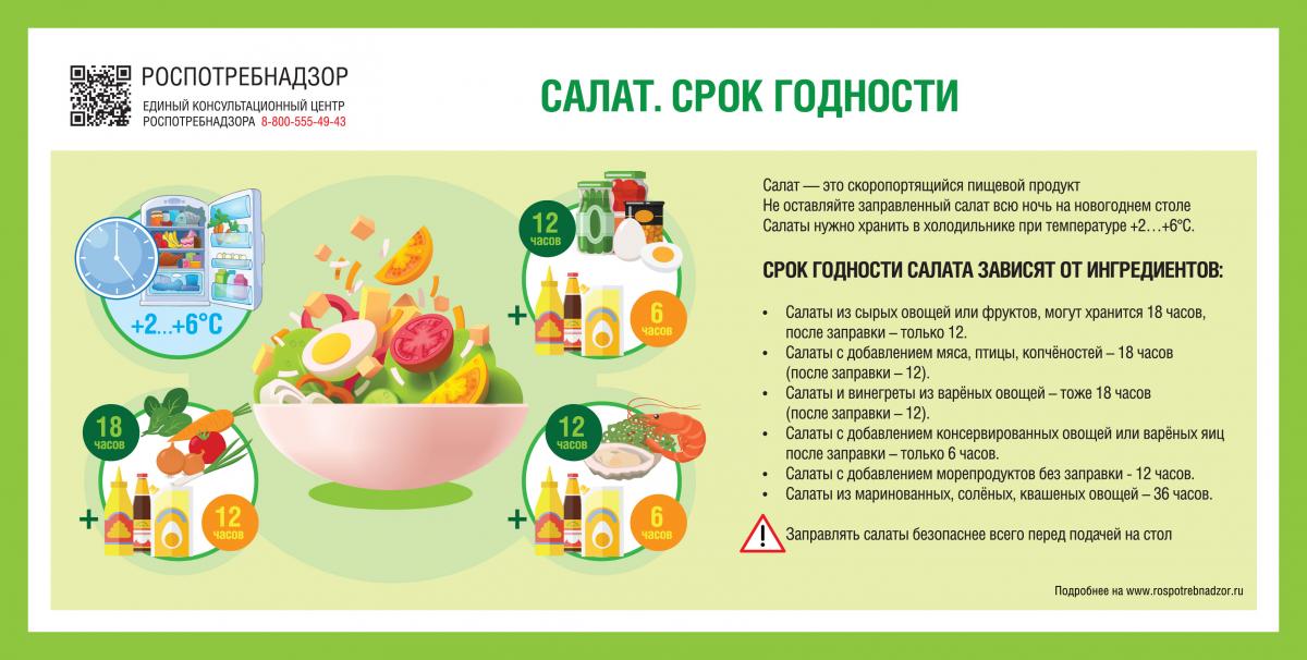 В салатах обычно смешивают продукты с разной стойкостью хранения, поэтому срок годности салата будет зависеть от рецепта. К тому же, салаты часто заправляют майонезом или другим соусом, а это ускоряет процессы размножения микробов. Поэтому салаты относят к скоропортящимся пищевым продуктам, которые рекомендуется хранить в холодильнике при температуре +2…+6ºС. Сроки годности салатов регламентированы: