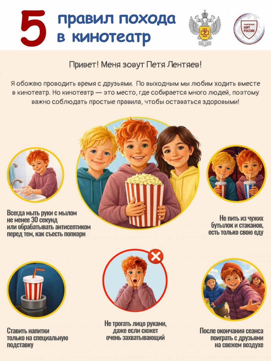 В первом выпуске Петя расскажет о важных санитарно-гигиенических правилах, которые нужно соблюдать в кинотеатре. Как и многие дети, по выходным наш герой любит вместе с друзьями ходить в кино и смотреть интересные фильмы. Но там собирается много людей, поэтому важно вести себя правильно, чтобы оставаться здоровыми. Что именно нужно делать – узнайте из инфографики.