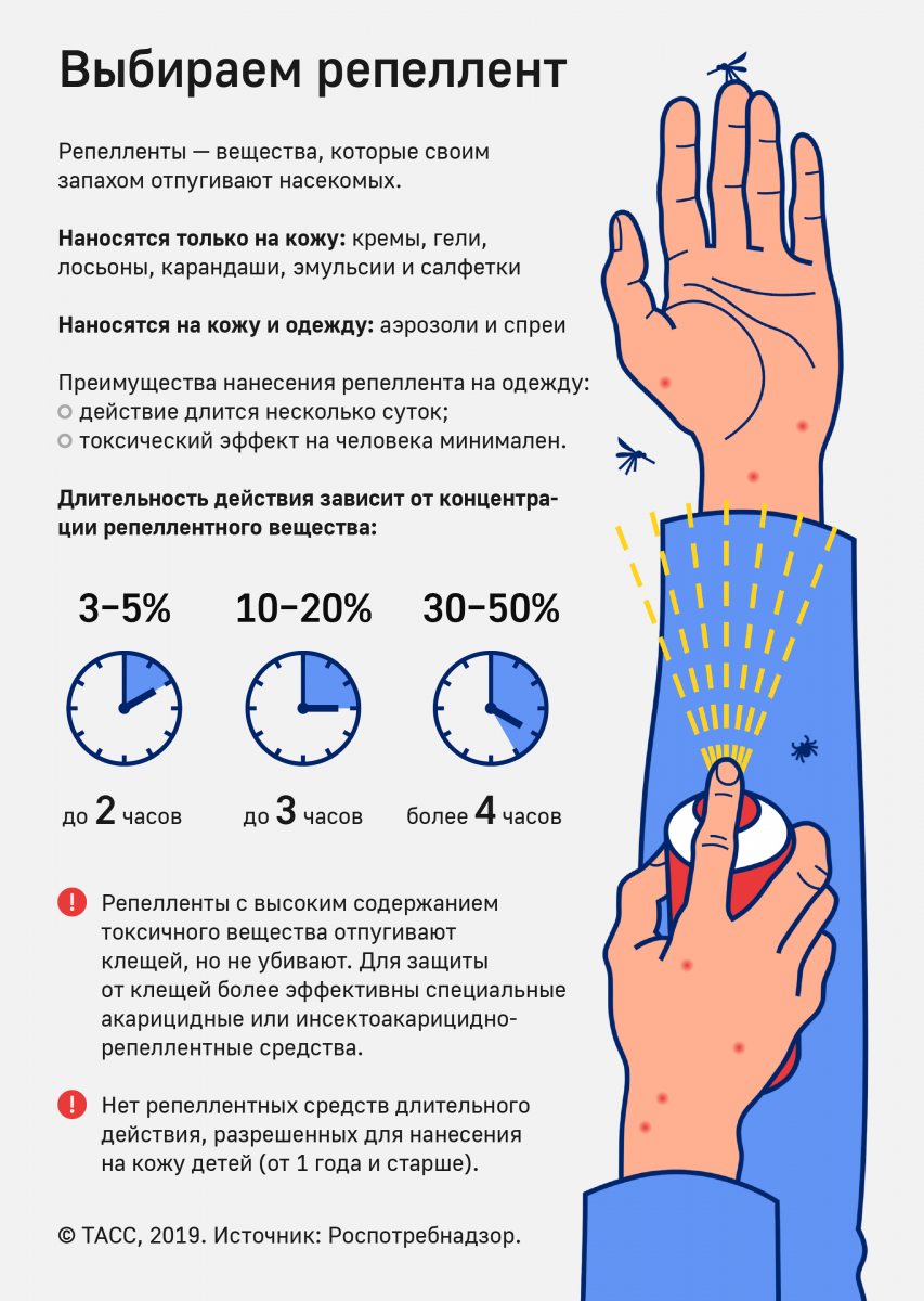 Приобретаете репеллентное средство в аэрозольной упаковке или спрей, содержащий более 25% ДЭТА (на этикетке должно быть написано: время защитного действия от насекомых при нанесении на кожу более 4 часов, при нанесении на одежду — до 20 суток).