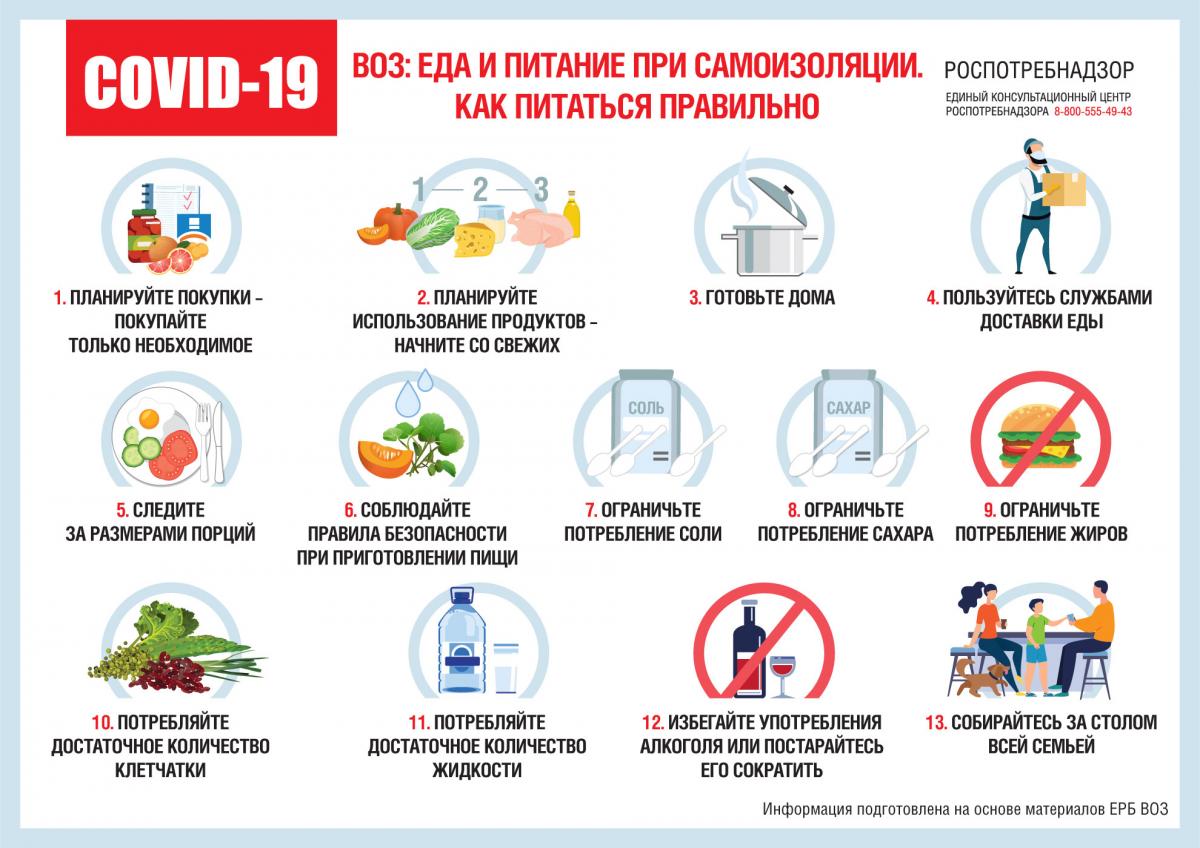 С советами по оптимальному выбору пищевых продуктов и несколькими рецептами для вдохновения можно ознакомиться на сайте Европейского бюро ВОЗ: http://www.euro.who.int/ru/health-topics/health-emergencies/coronavirus-covid-19/novel-coronavirus-2019-ncov-technical-guidance/food-and-nutrition-tips-during-self-quarantine